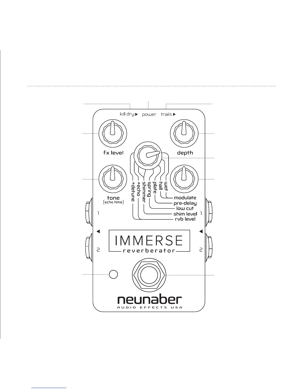 Neunaber IMMERSE - Pedal Controls Overview; Effect Level and Tone Controls; Depth and Reverb Selector; Kill Dry and Trails Switches
