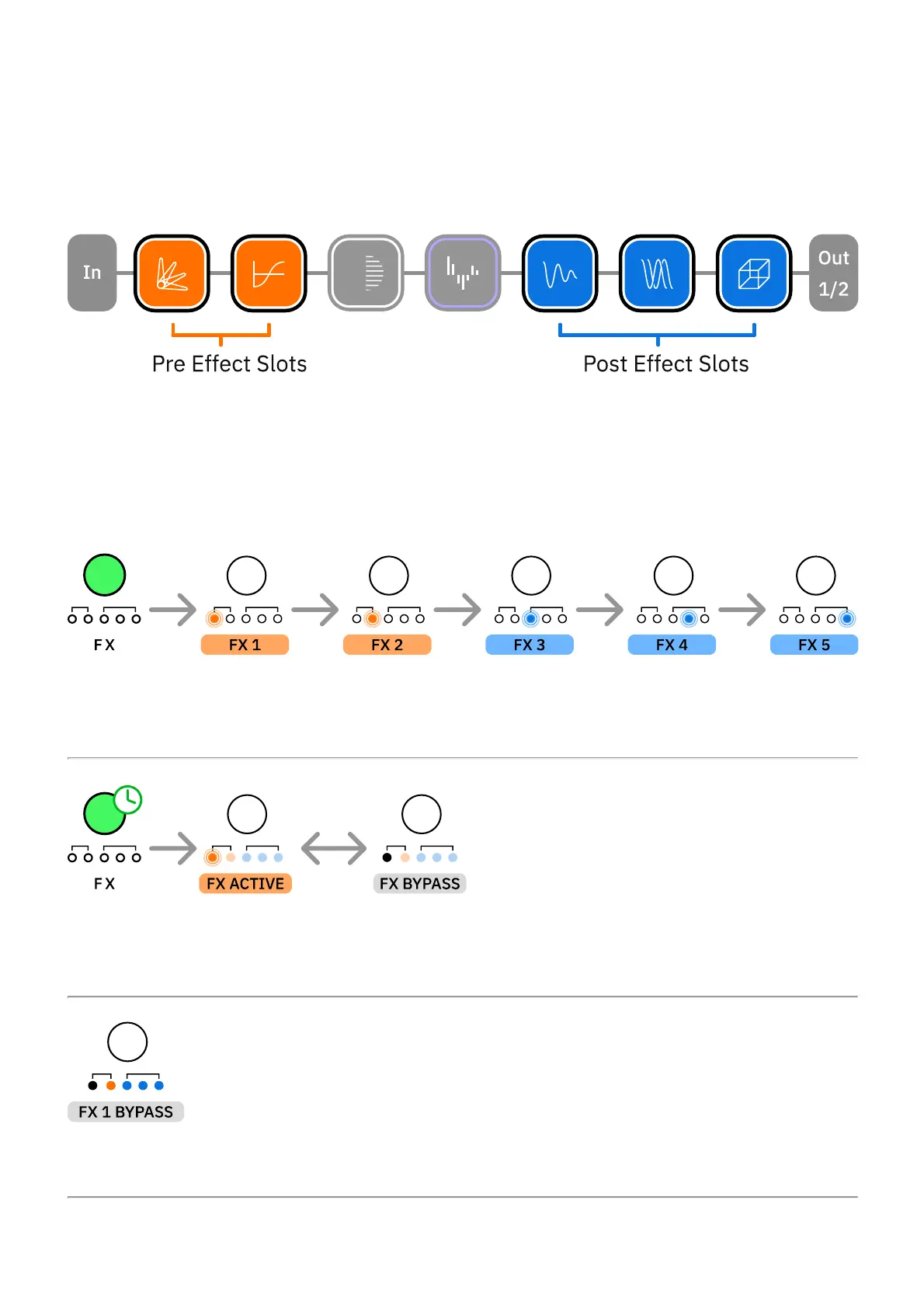 Press FX to cycle through effects slots. LEDs will blink indicating the slot that is currently