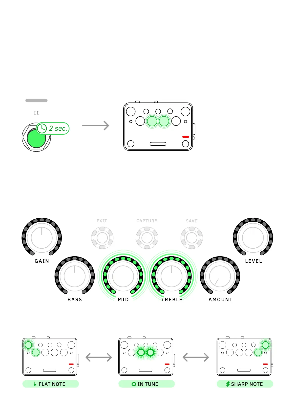 The GAIN, BASS, MID, TREBLE, AMOUNT, and LEVEL LED rings will illuminate when a note is