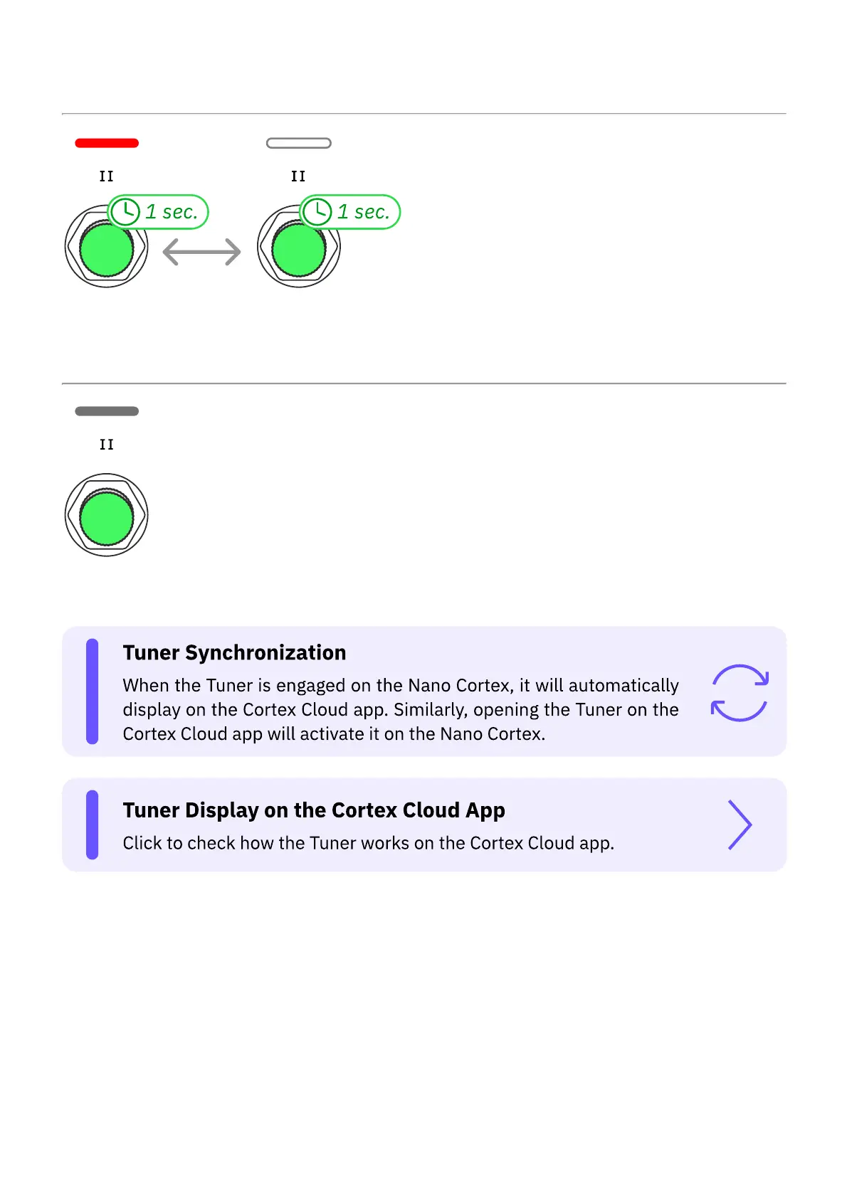 Press-and-hold Footswitch II for 1 second to mute/unmute the input signal when the Tuner is