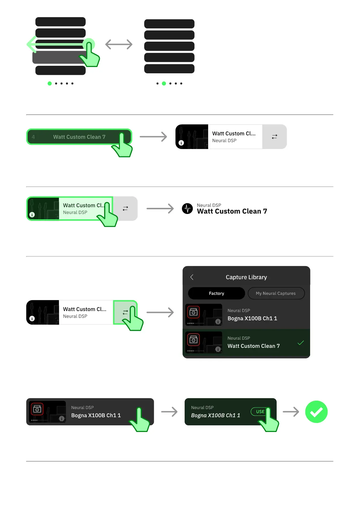 Tap a Neural Capture to audition it. Tap USE to load it in the current slot.