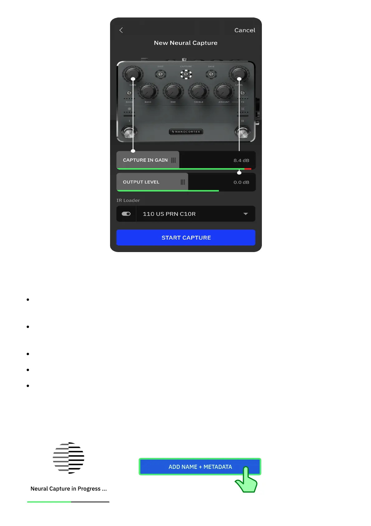 Ensure the target device's settings are set to your liking and the Nano Cortex's GAIN knob is at