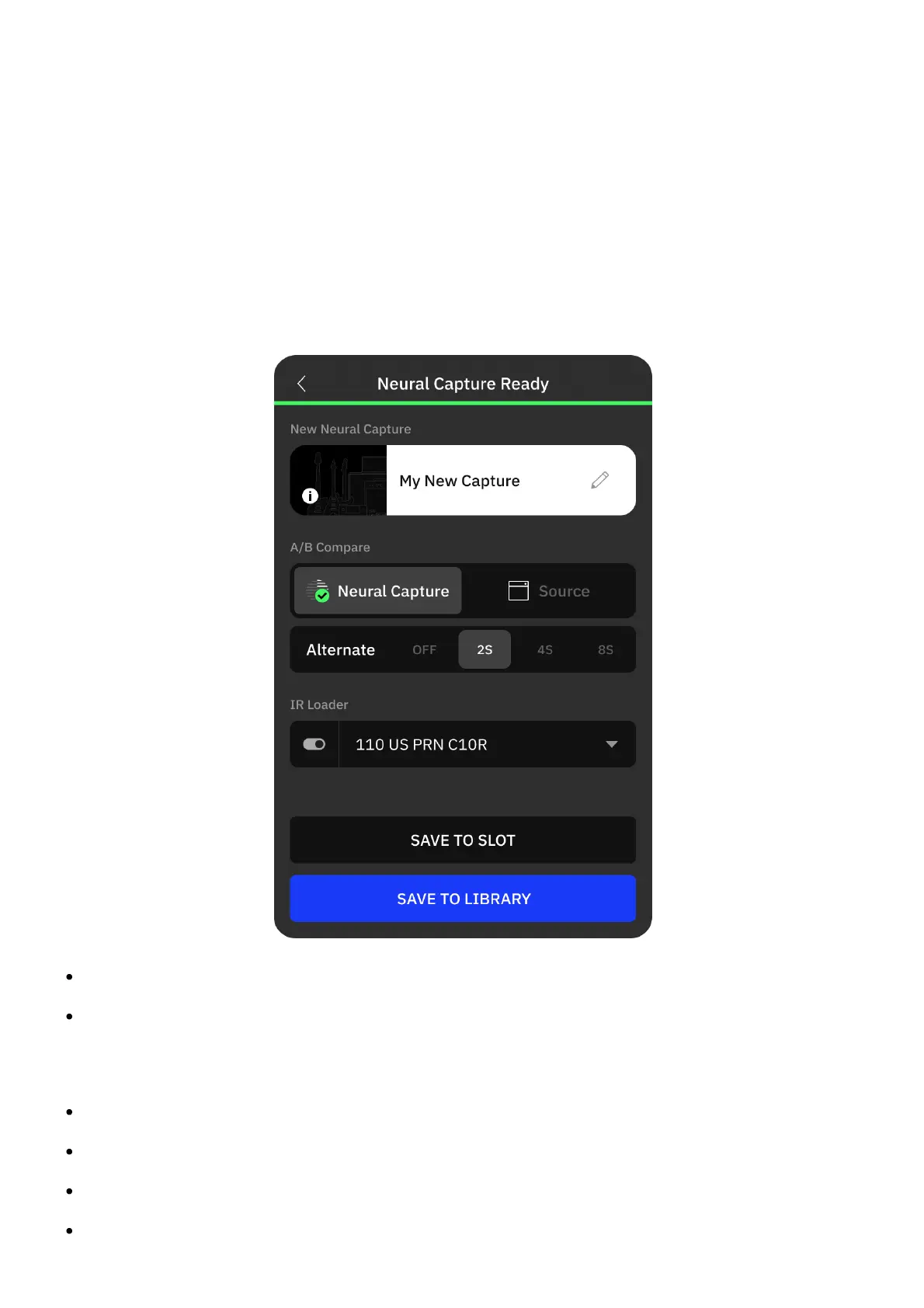 SAVE TO SLOT: Tap to save the recently created Neural Capture to a Capture slot.