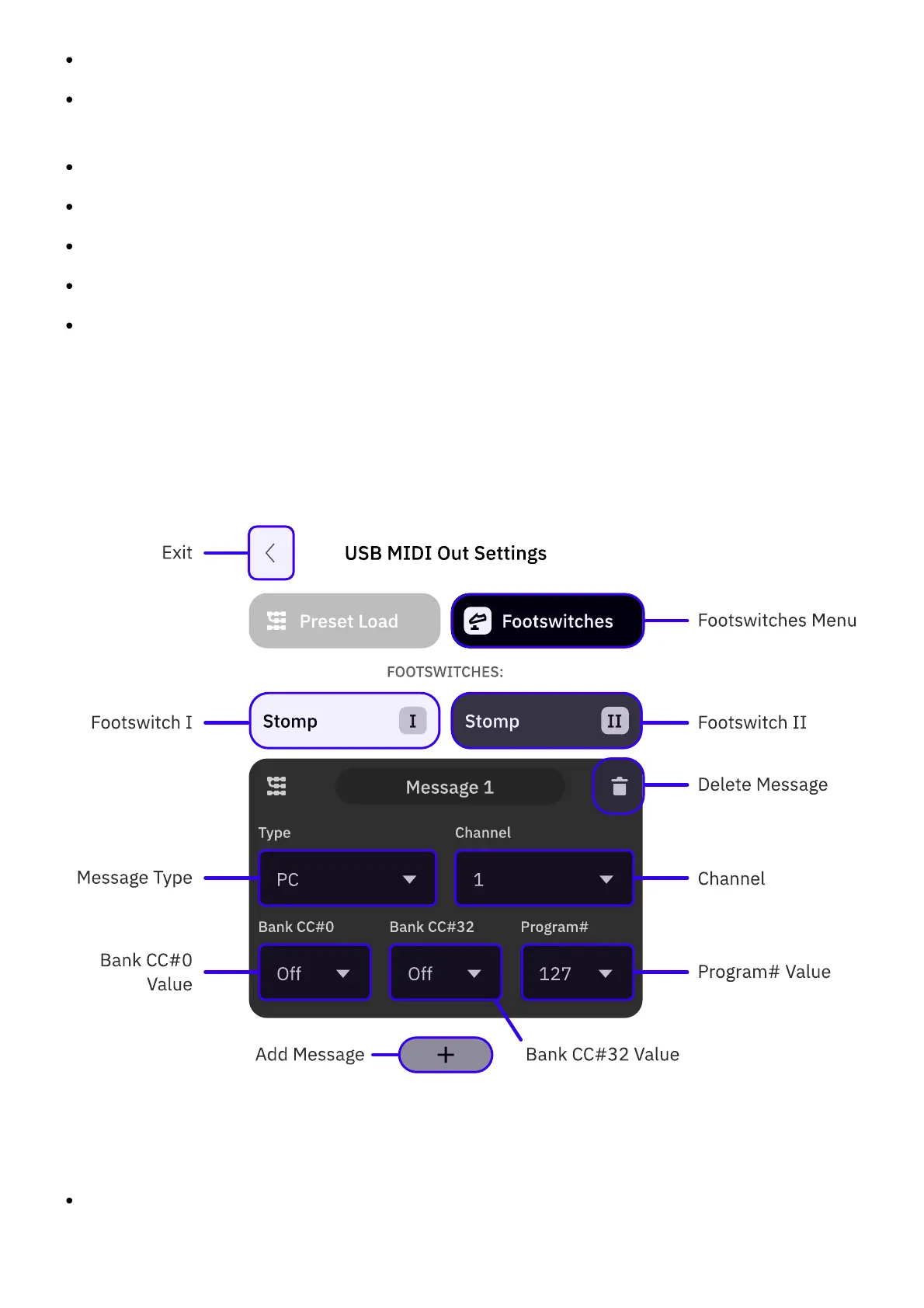 You can assign up to 12 MIDI messages per footswitch that will be sent via USB