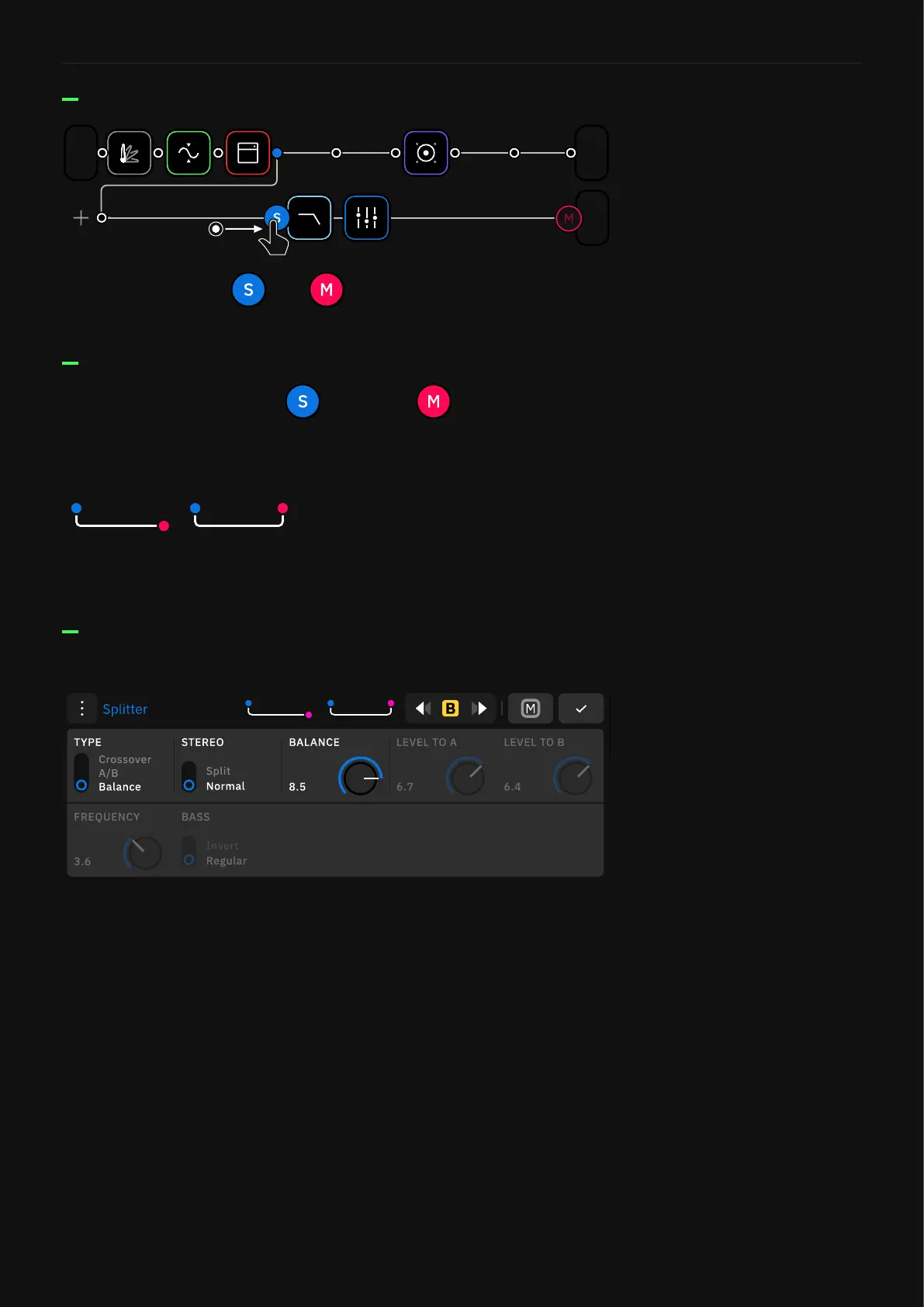 • LEVEL TO B KNOB: Sets the amount of signal to the Splitter/