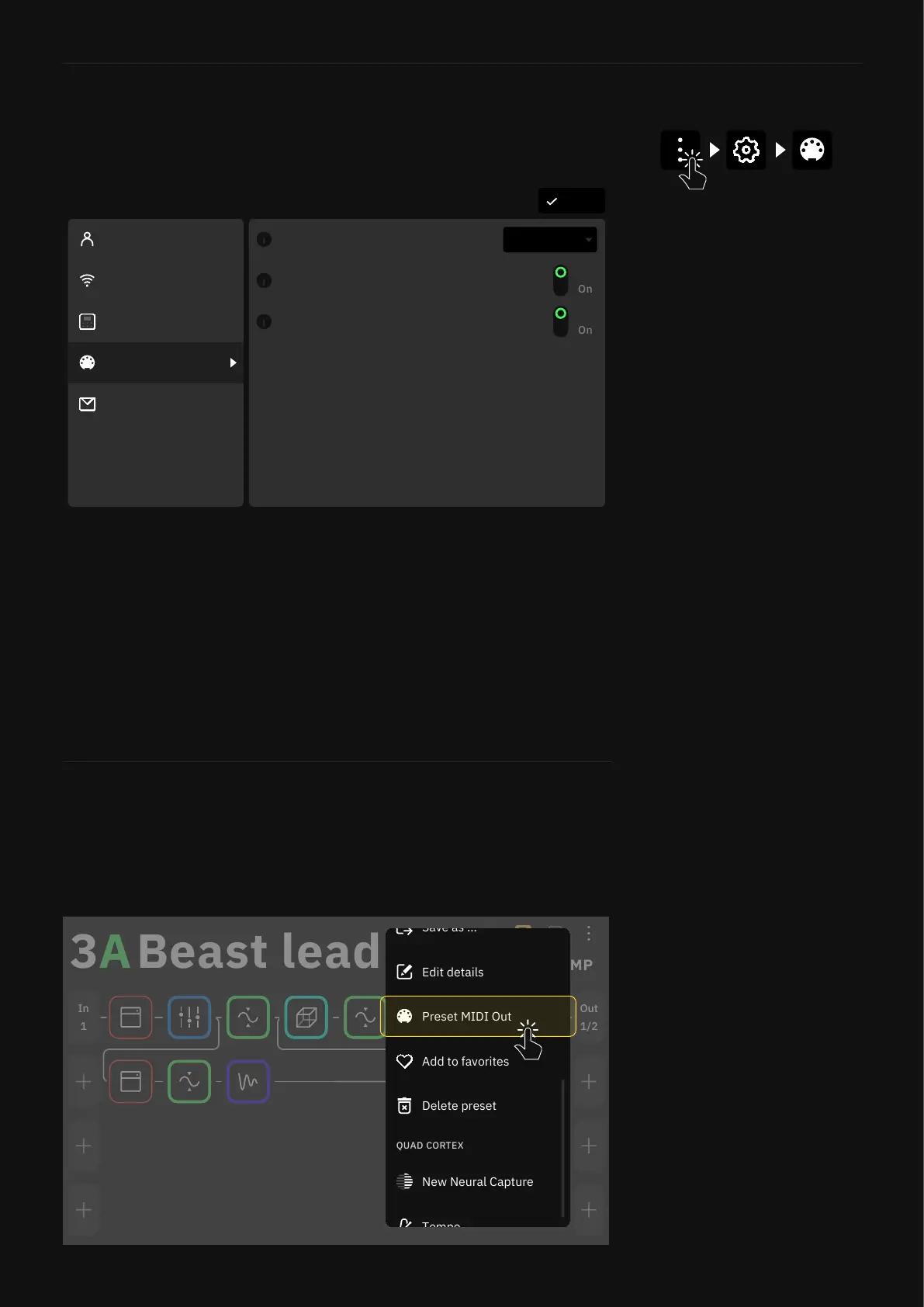 • MIDI CHANNEL LIST: Sets the Quad Cortex base MIDI