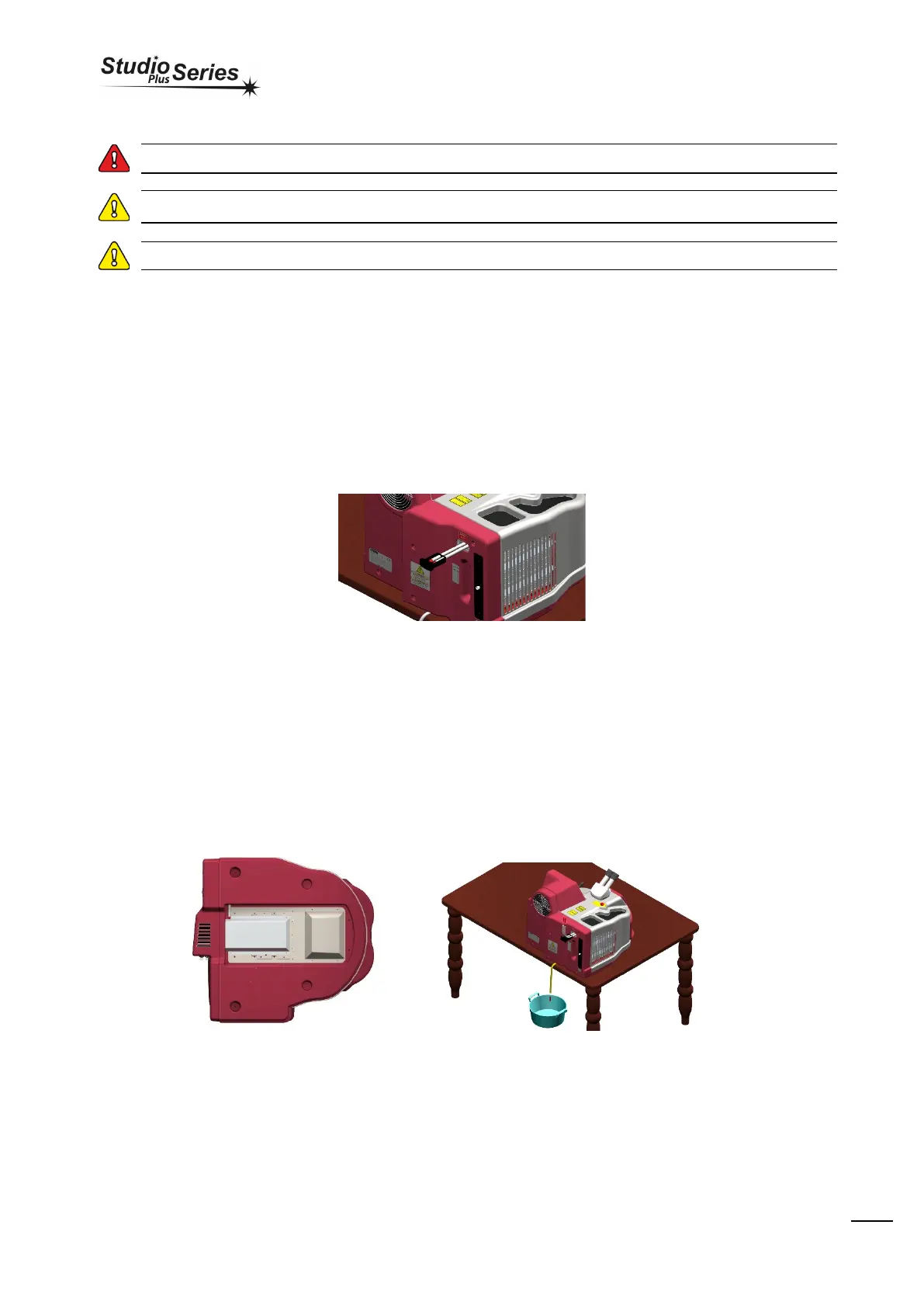 Pull the small pipe located underneath the LASER base, remove the cap (see picture); place the basin under the opened pipe and wait the water