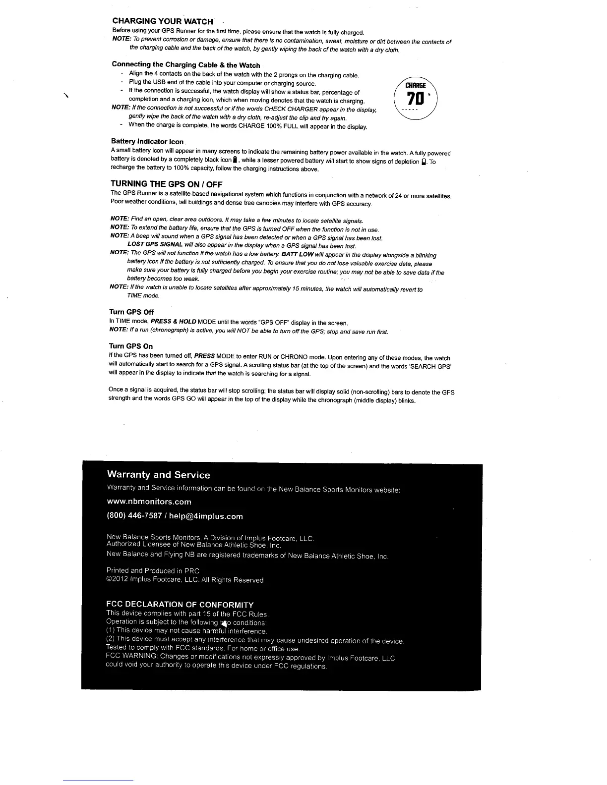 New Balance GPS Runner - Watch Charging and GPS Operation; Charging Your Watch; Turning the GPS On;Off