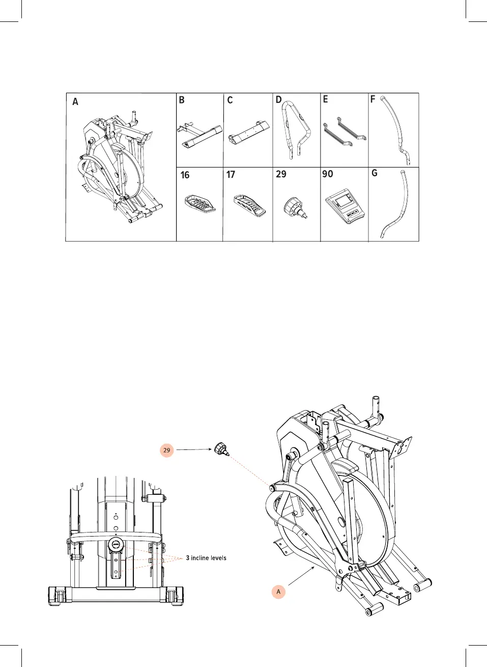 Insert the spring locking knob through 1 of the 3 respective holes to set the incline