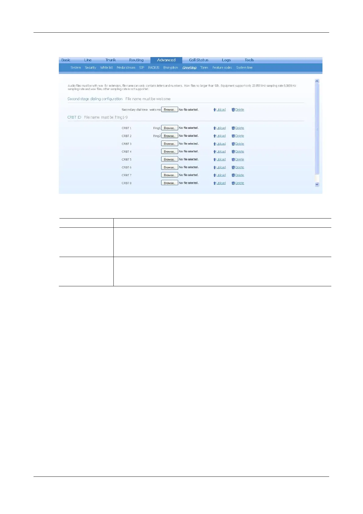 If you want to delete the current customized second stage dialing tone, click Delete. After the