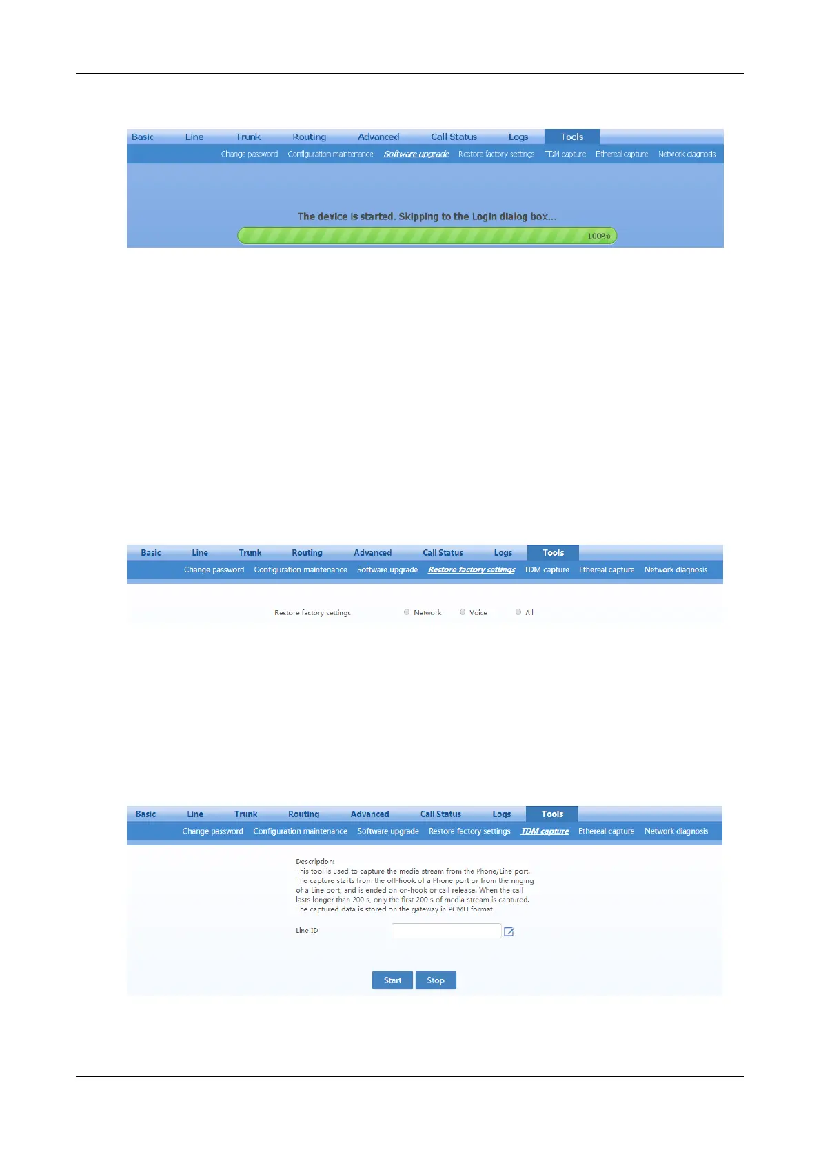 After login, click Tools > TDM capture to open this interface. This tool can be used to capture the voice