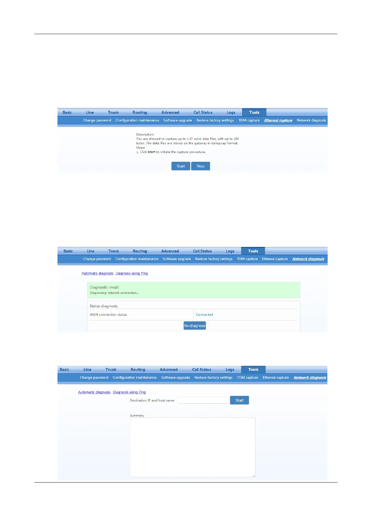 After login, click Tools > Ethereal capture to open this interface. You are allowed to capture up to three