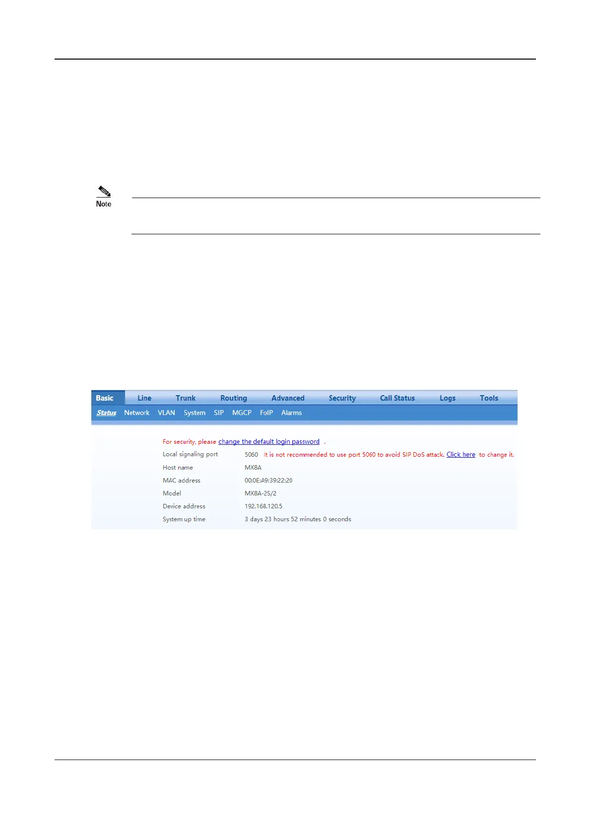 After login, open the Basic tab page to view device information. If the SIP port of the device is 5060, you