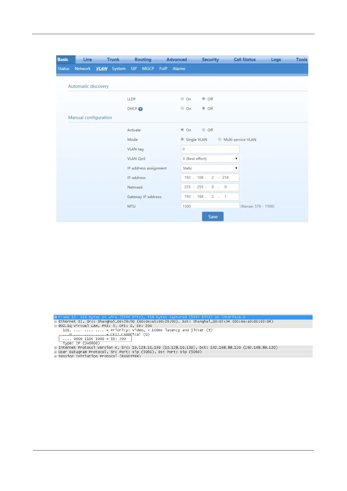 the device. Check that all data packets sent by the device carry a VLAN ID 200, as shown in Figure 3-92.