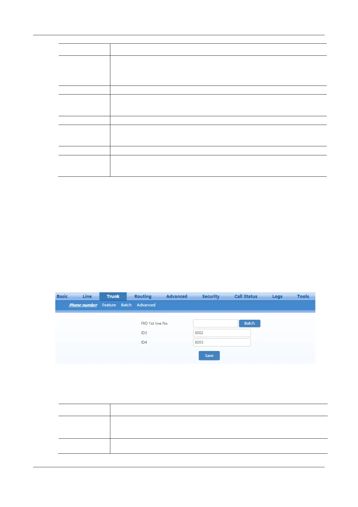After login, click Trunk > Phone number to open the configuration interface.