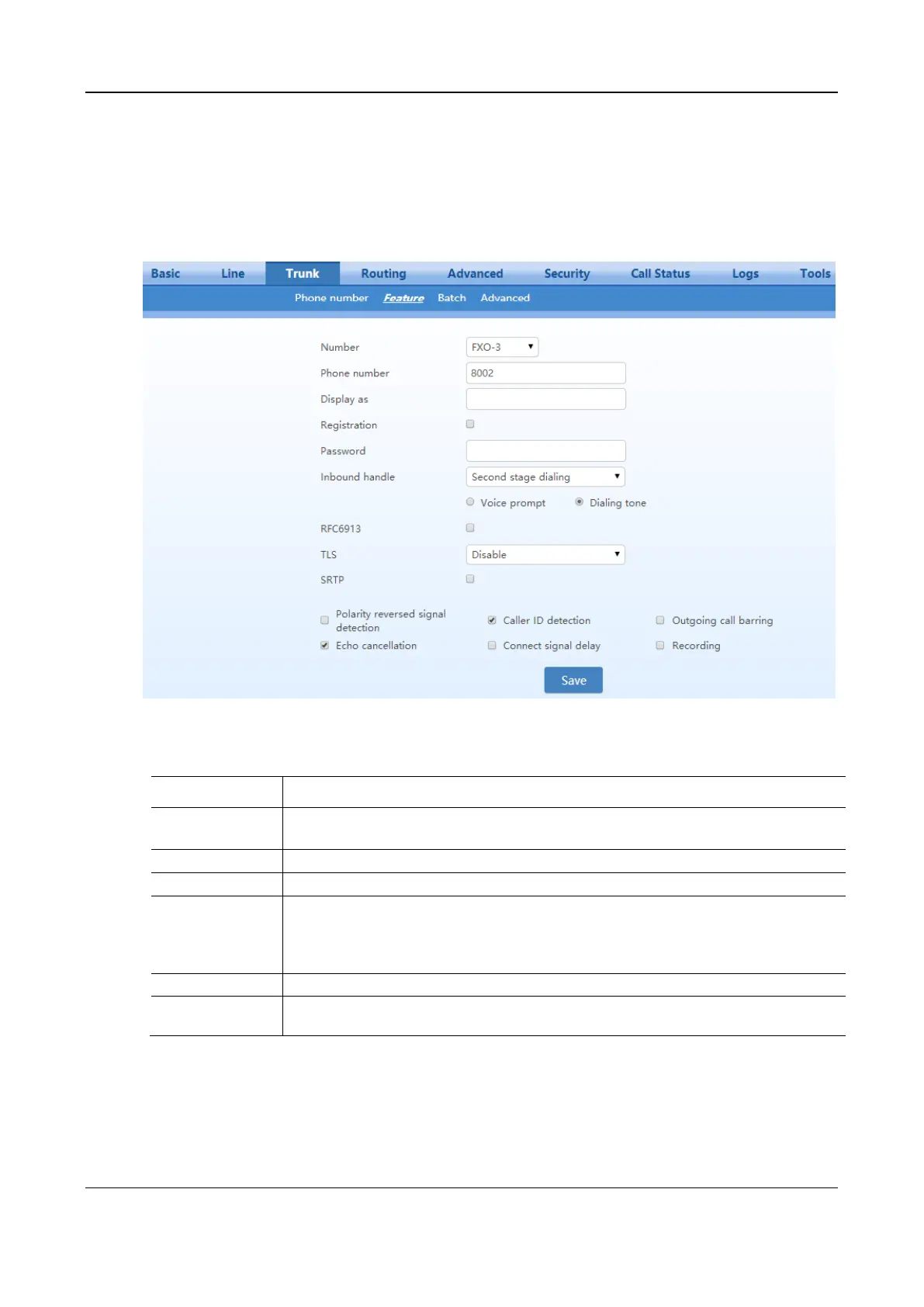 Select a trunk line required to configure. “FXO-n” corresponds to the Trunk>Phone