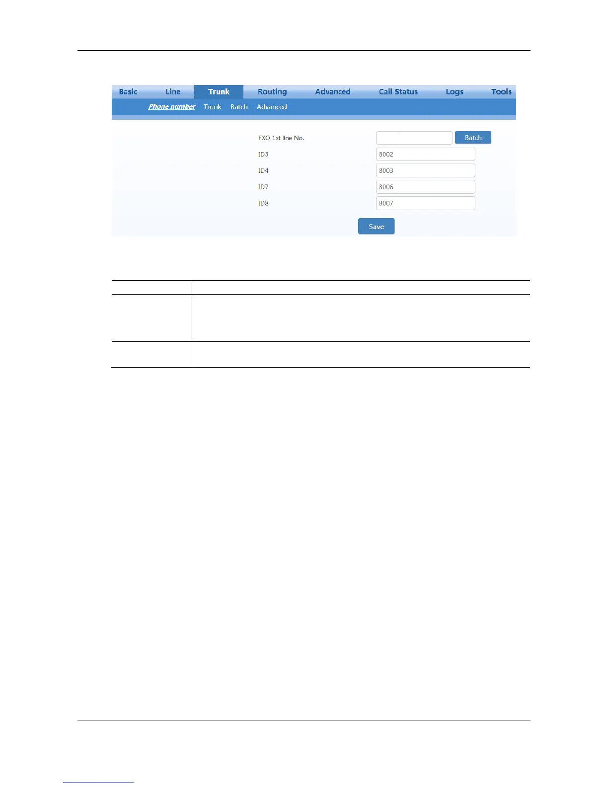 This number is used for the fast setup of consecutive number of trunk line. Click Batch