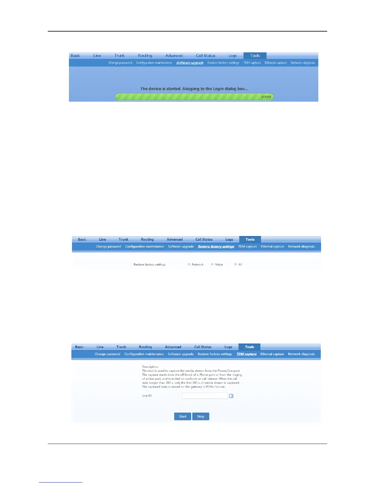 After login, click Tools > TDM capture to open this interface. This tool can be used to capture the voice