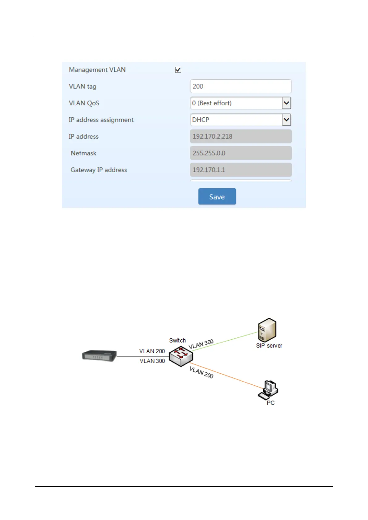 VLAN 200 and VLAN 300. The port for connecting the switch and SIP server is added to VLAN 300.