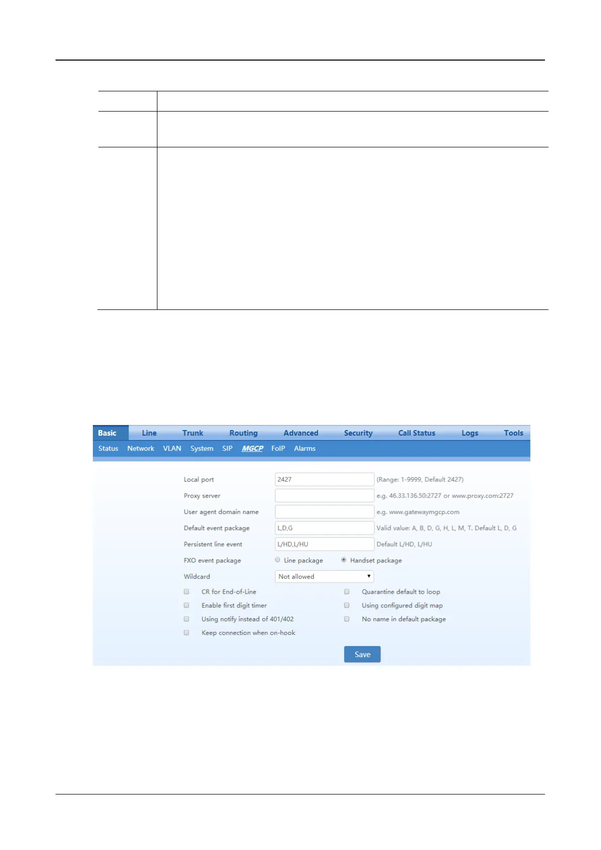 After login, click Basic > MGCP to open the configuration interface.