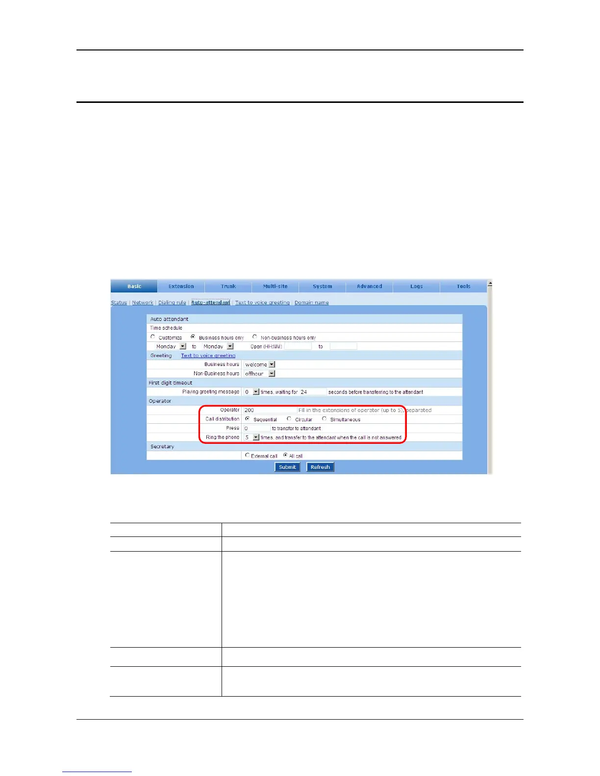 Click Basic > Auto Attendant to add more operators or to change auto attendant related settings. See