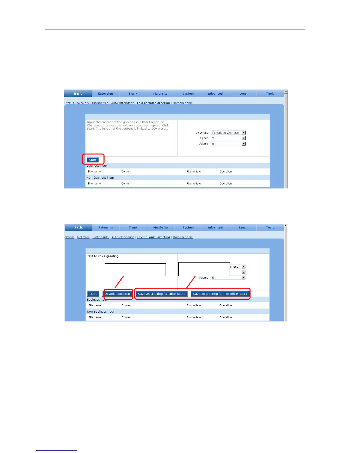 Go to the Basic > Text to voice greeting page. Input the content of greeting in either English or