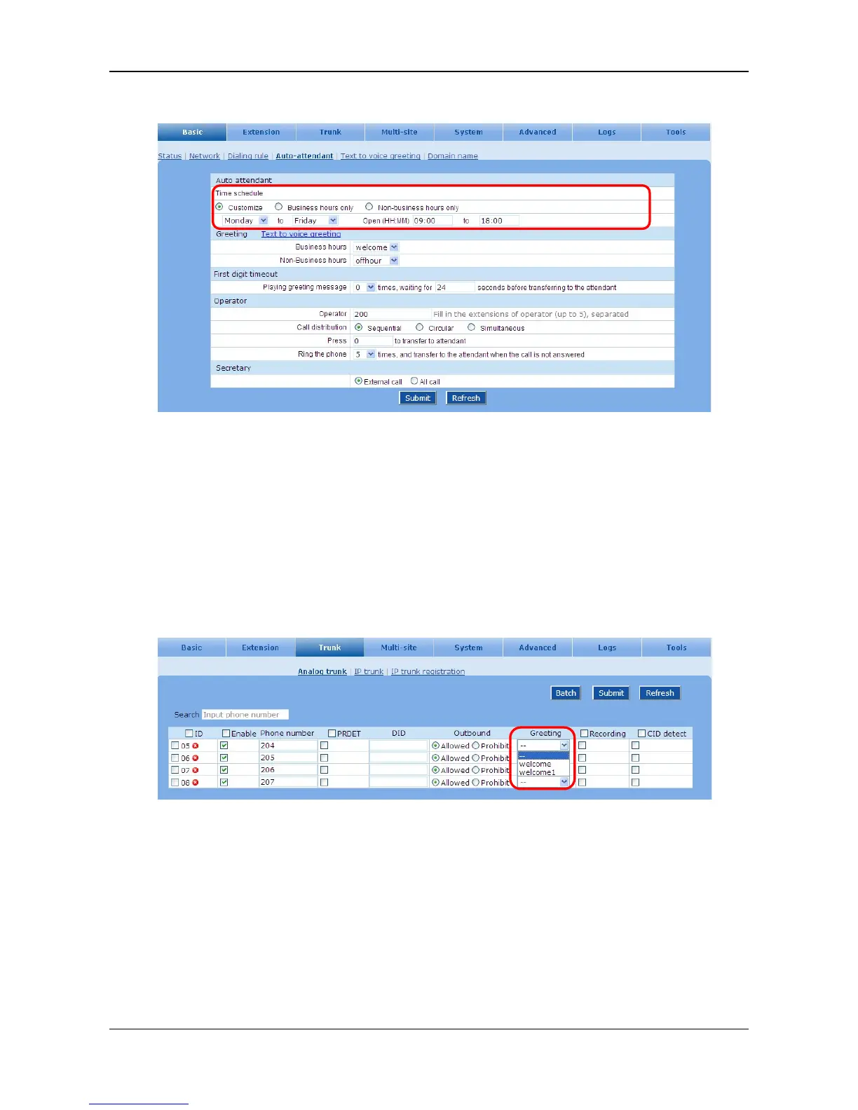 Go to the Trunk > Analog trunk page to select a greeting from the drop-down list. See Figure 2-10.