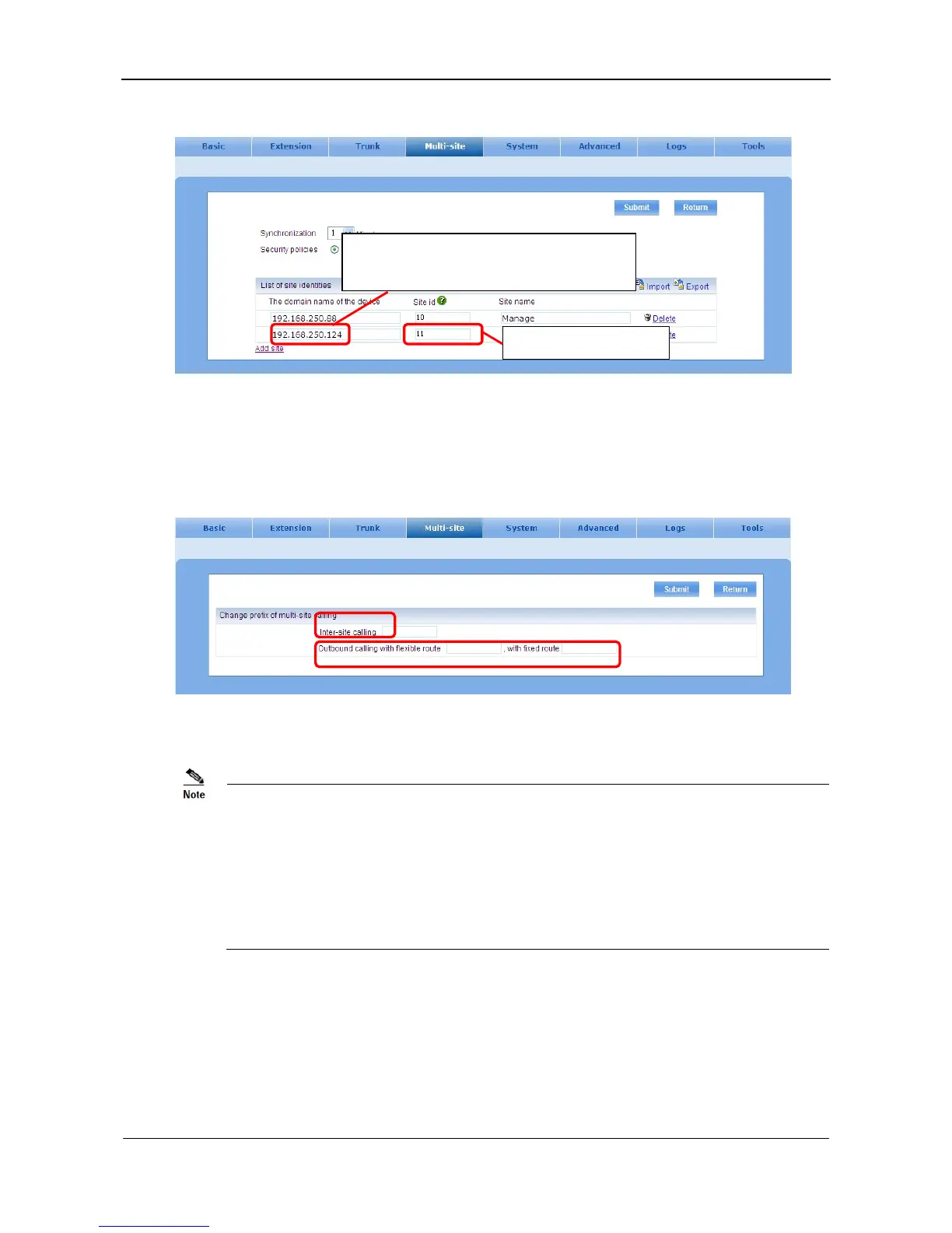 Dialing prefix of inter-site calling is dialed before the extension number of the remote site. For