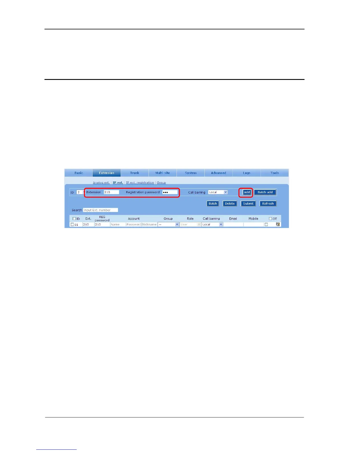 Go to the Extension > IP ext. page and enter the extension number and registration password.