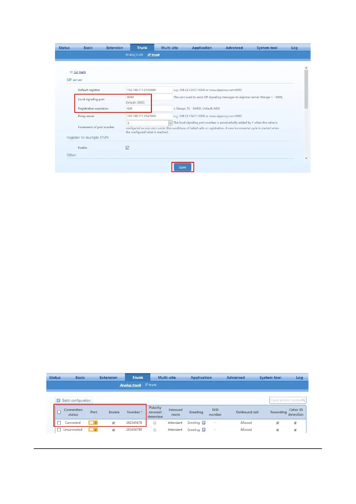 After the devices reboot, click Trunk > IP trunk. Verify that the line is registered. You may