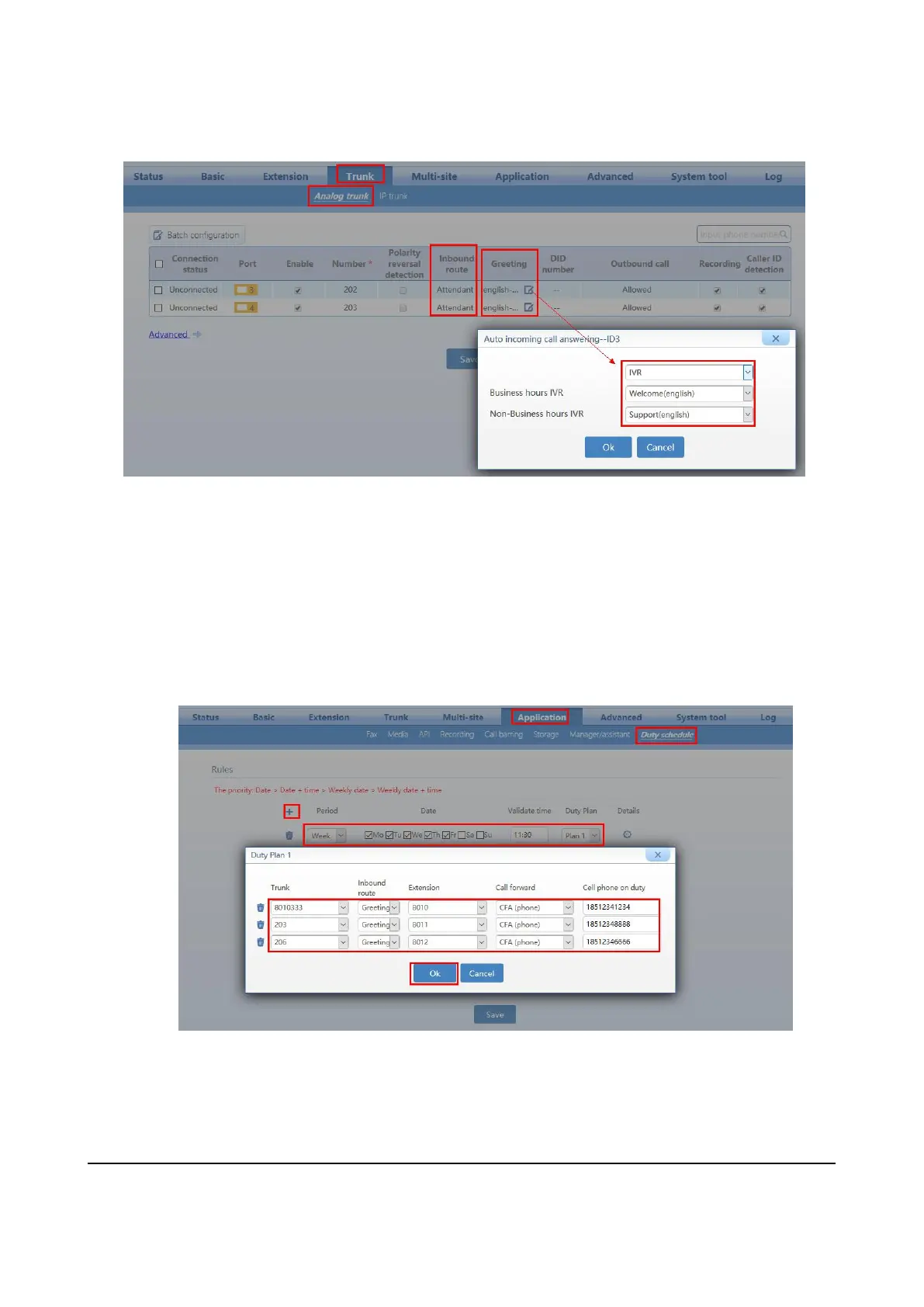 create the Duty Plan according to the given template ( fill in the trunk number , inbound route, extension