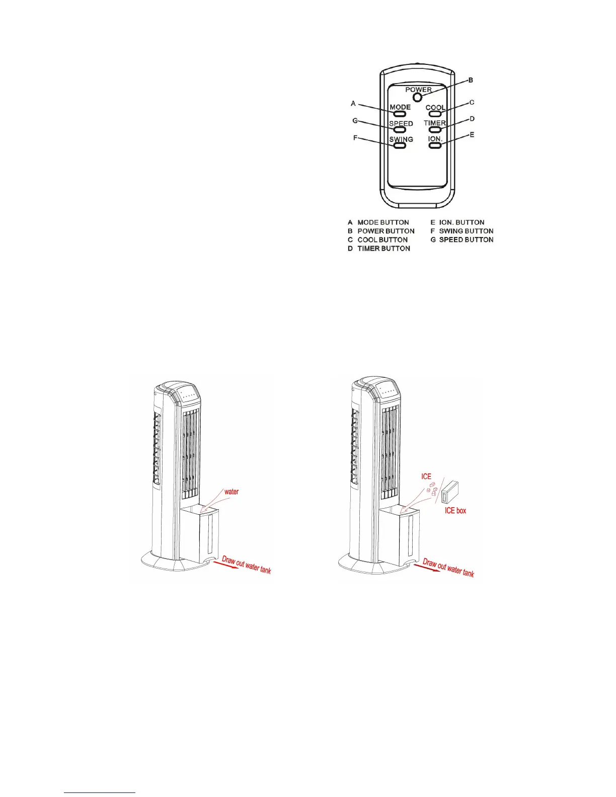 1. Pull out the water tank and fill it with water before operating the fan (see Figure 3). Do not