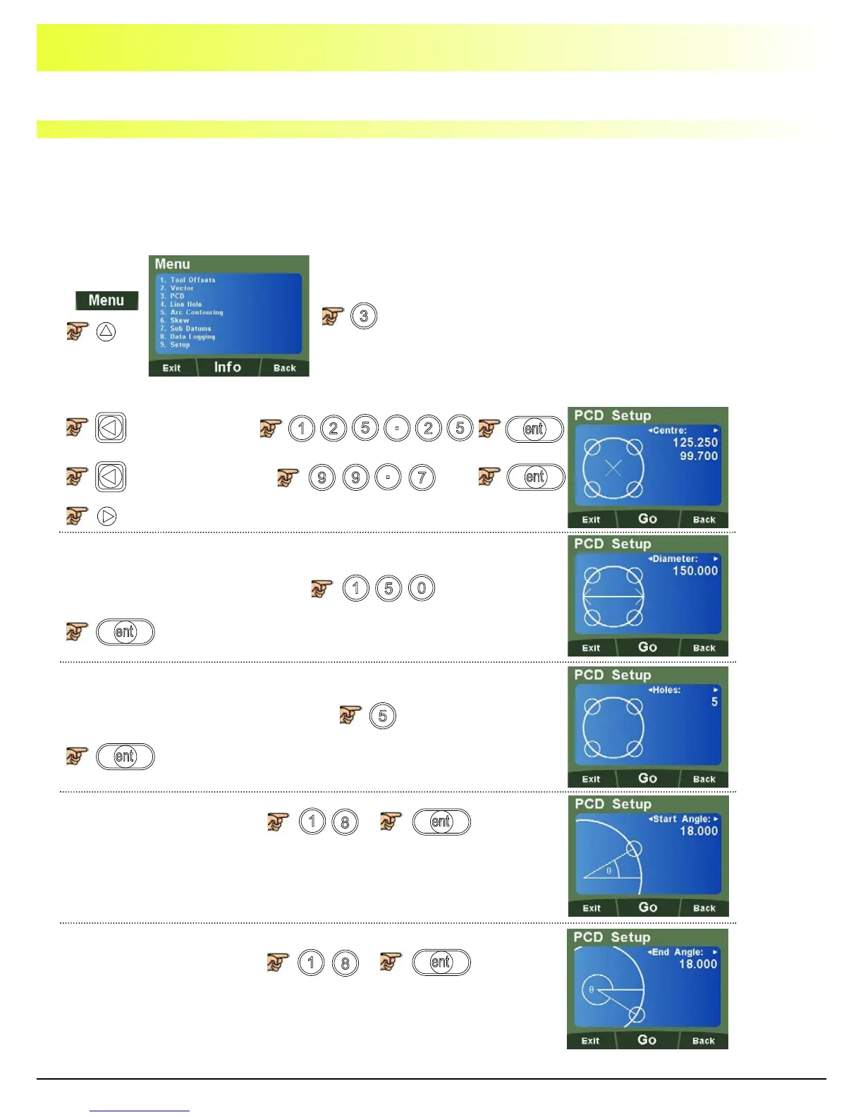 circle. Once the parameter data is entered, the DP1200 displays the distance to the next hole.