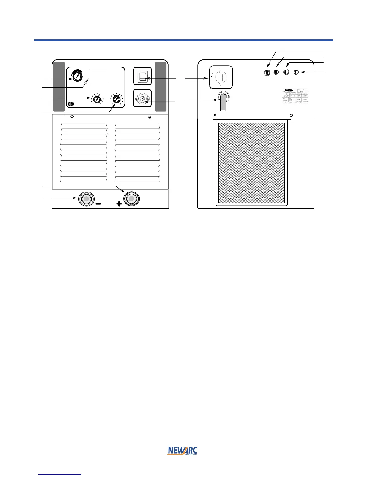2. Digital Display - Indicates welding current in Amps, welding voltage in Volts. The display also gives an indication when the machine is over tempera-