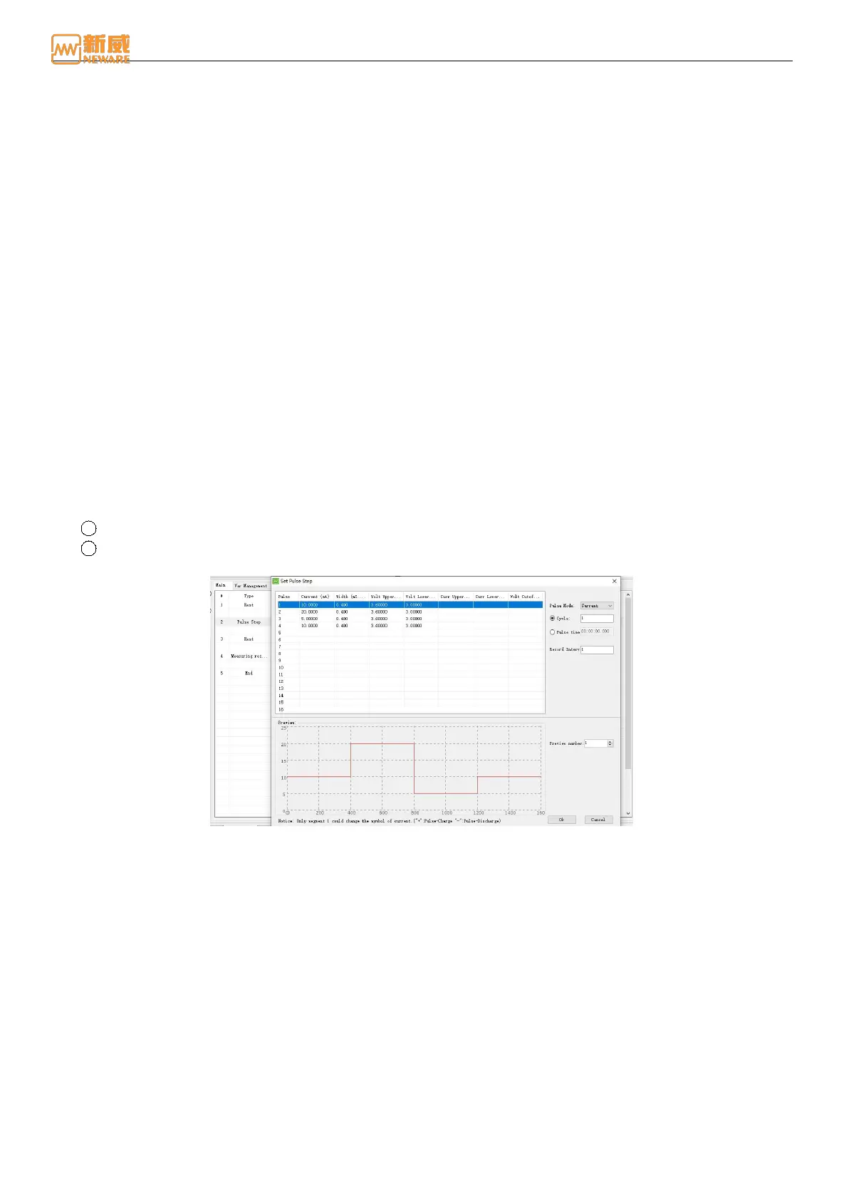 that of pulse 1. Generally, pulse 1 can be set to 10 S and current 0.1 C, while pulse 2 can be set to time 1 S and current
