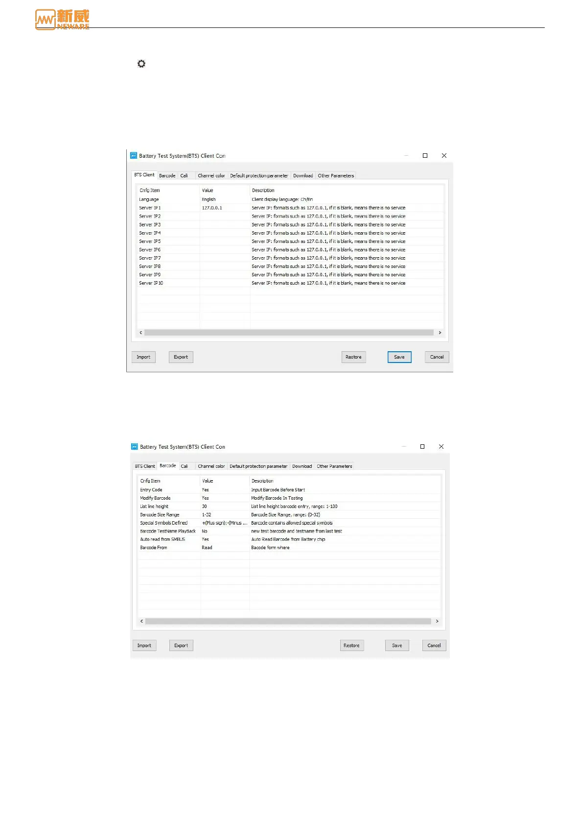Click the setting button in the title bar, and in the "Battery Test System (BTS) Client Configuration" dialog box that pops