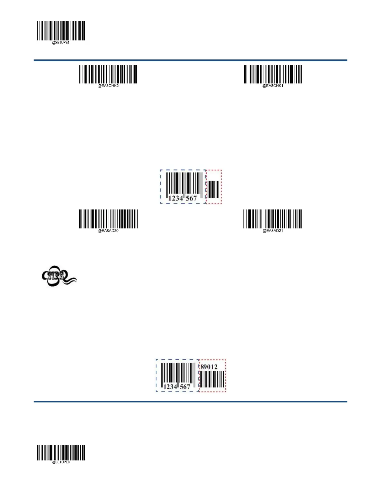 EAN-8 바코드는 5 자릿수의 애드온 코드로 새로운 형태의 코드를 작성할 수 있습니다. 아래 예에서 파란색 점선으로 둘러