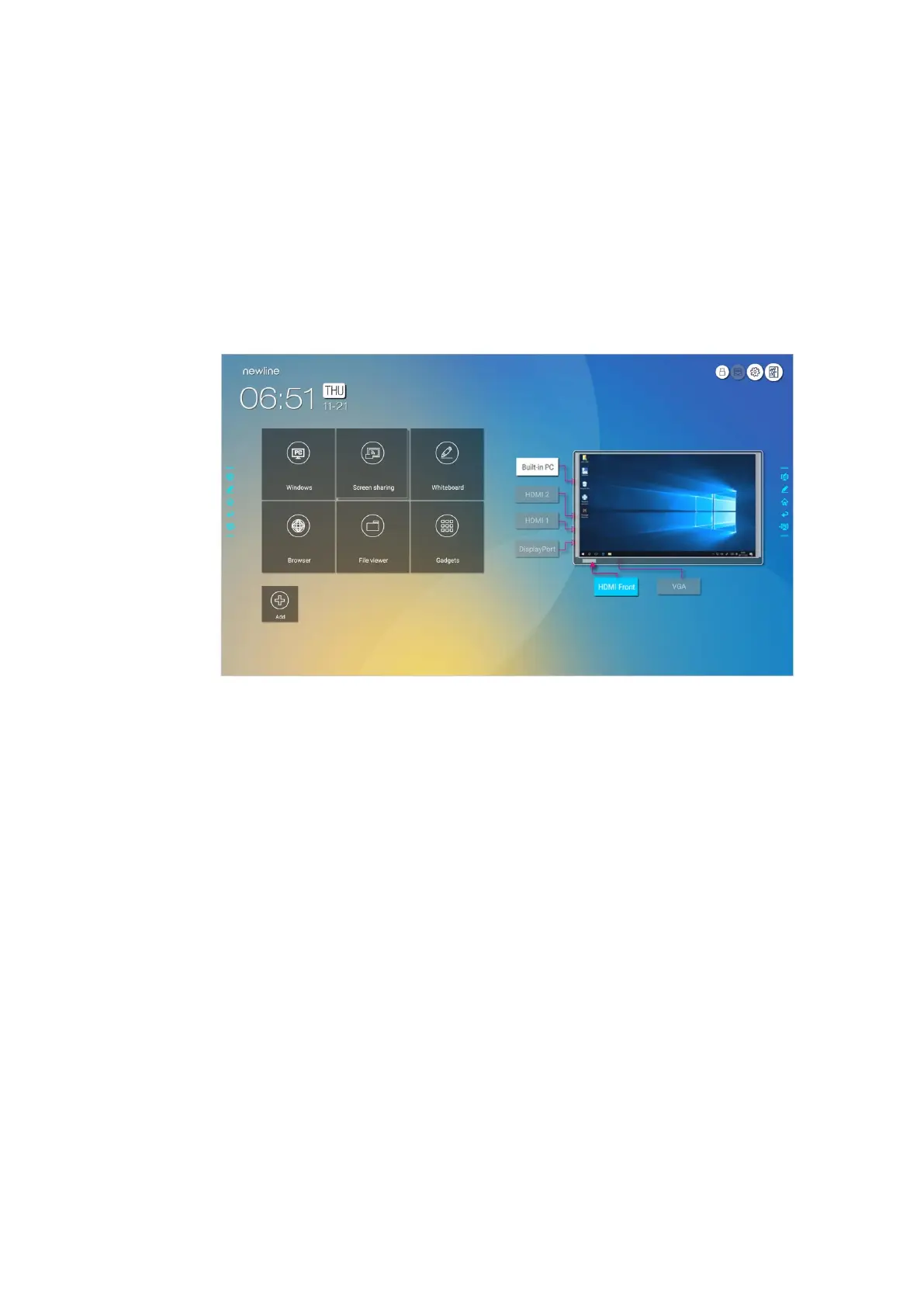 On the Home page, signal source preview window including internal PC, HDMI Front,