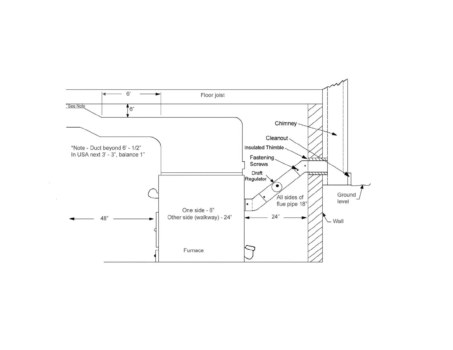 FIG. 6 - FLUE PIPE CONNECTION & MINIMUM INSTALLATION CLEARANCES