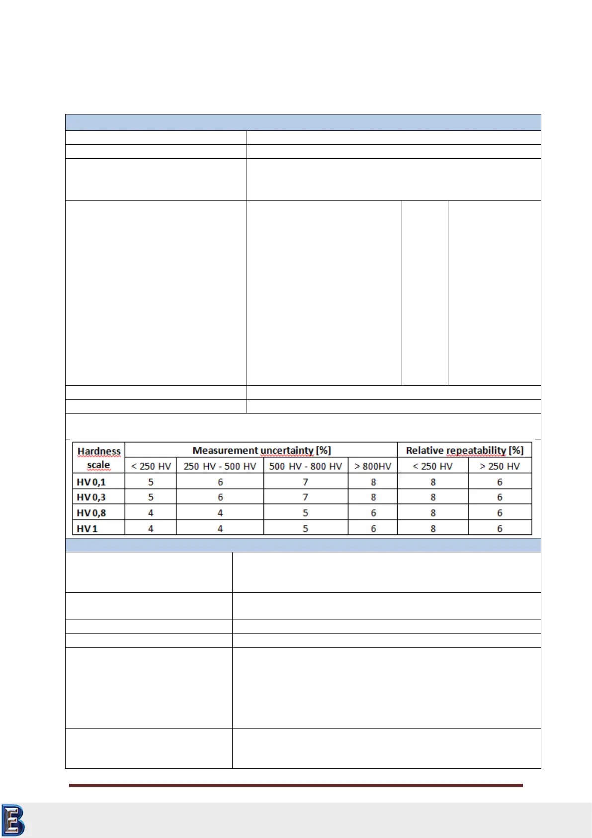 < 5 % (HV5, HV 10). For other test loads and ranges see table below.