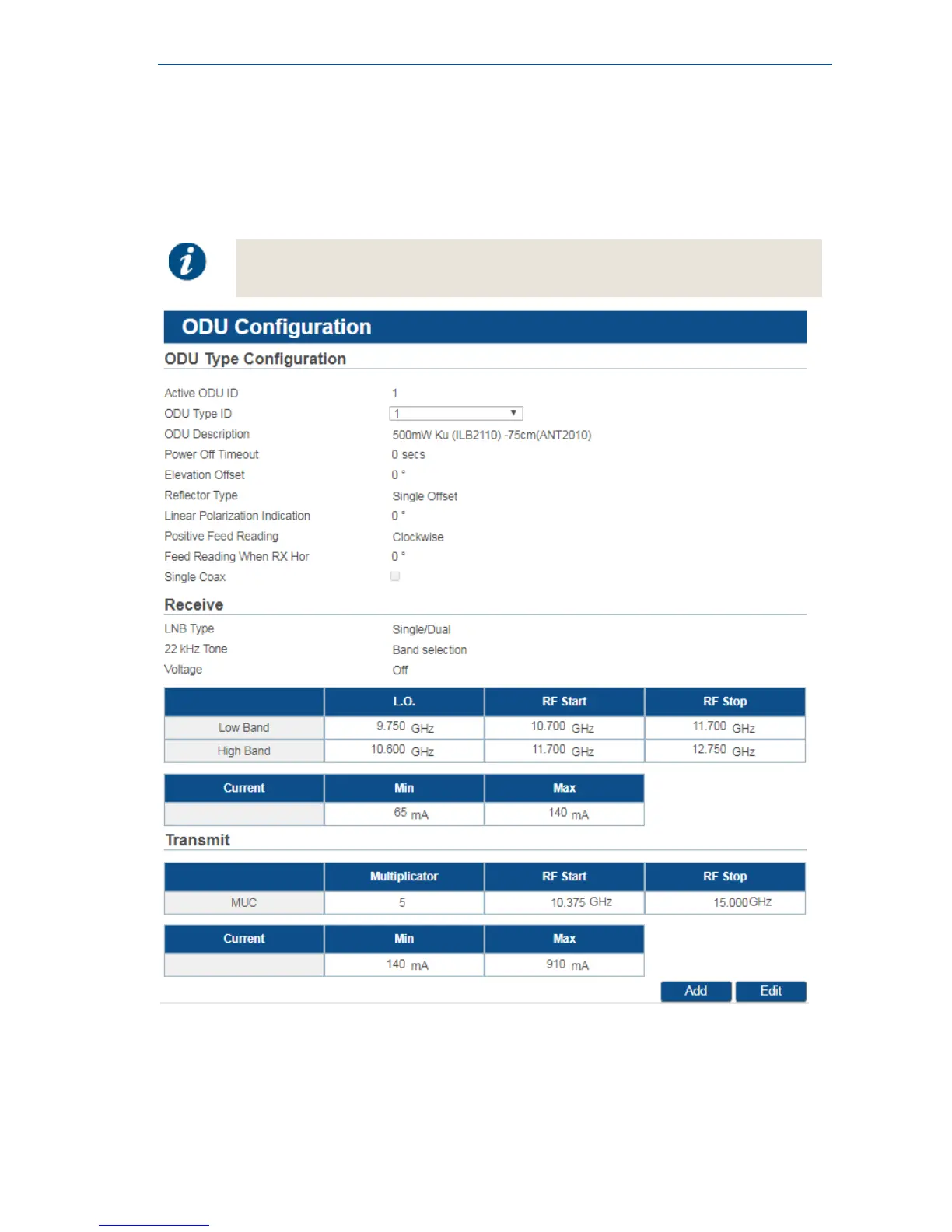 Edit or Add buttons are not present and the ODU configuration settings are read-only.