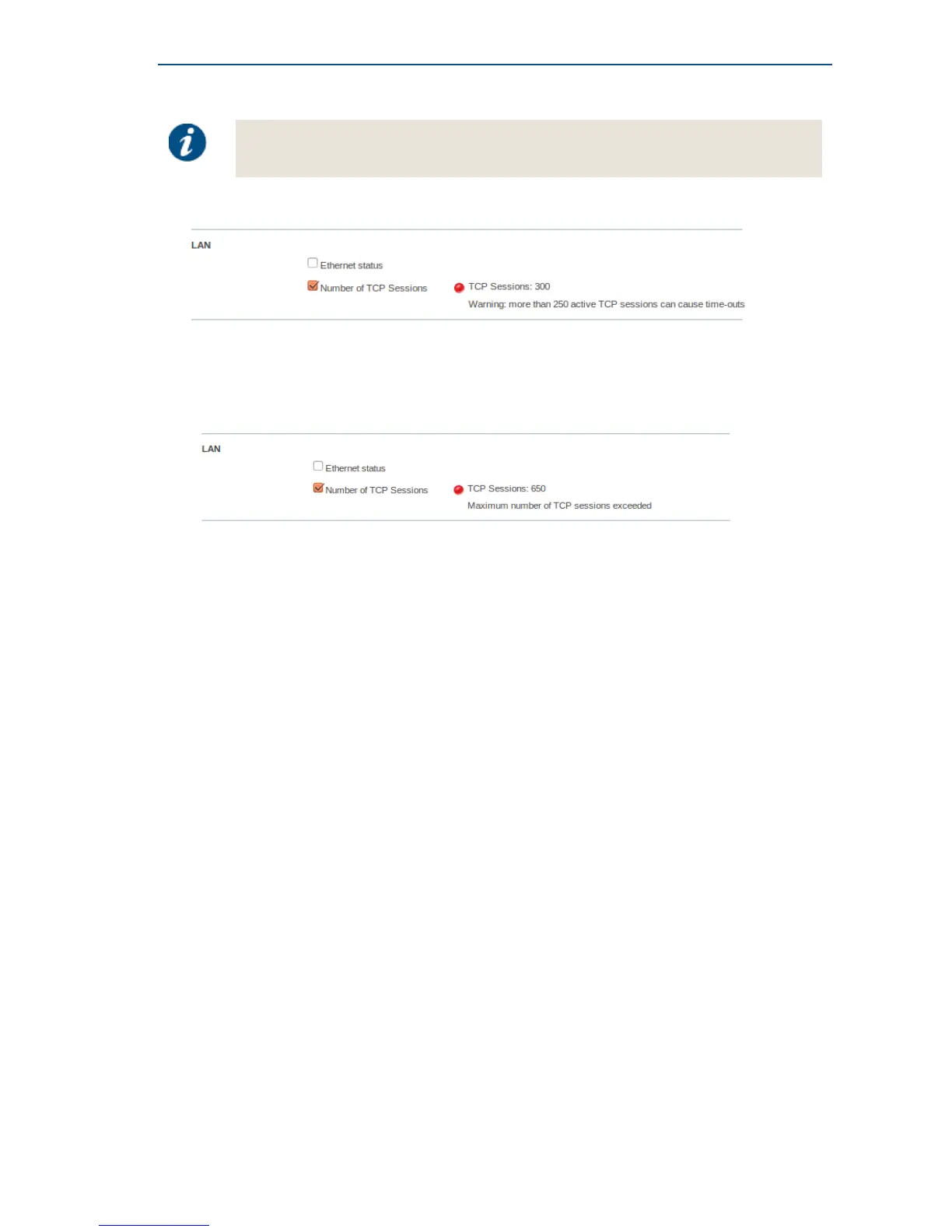• If more than half the maximum allowed number of TCP sessions is active, a warning message is
