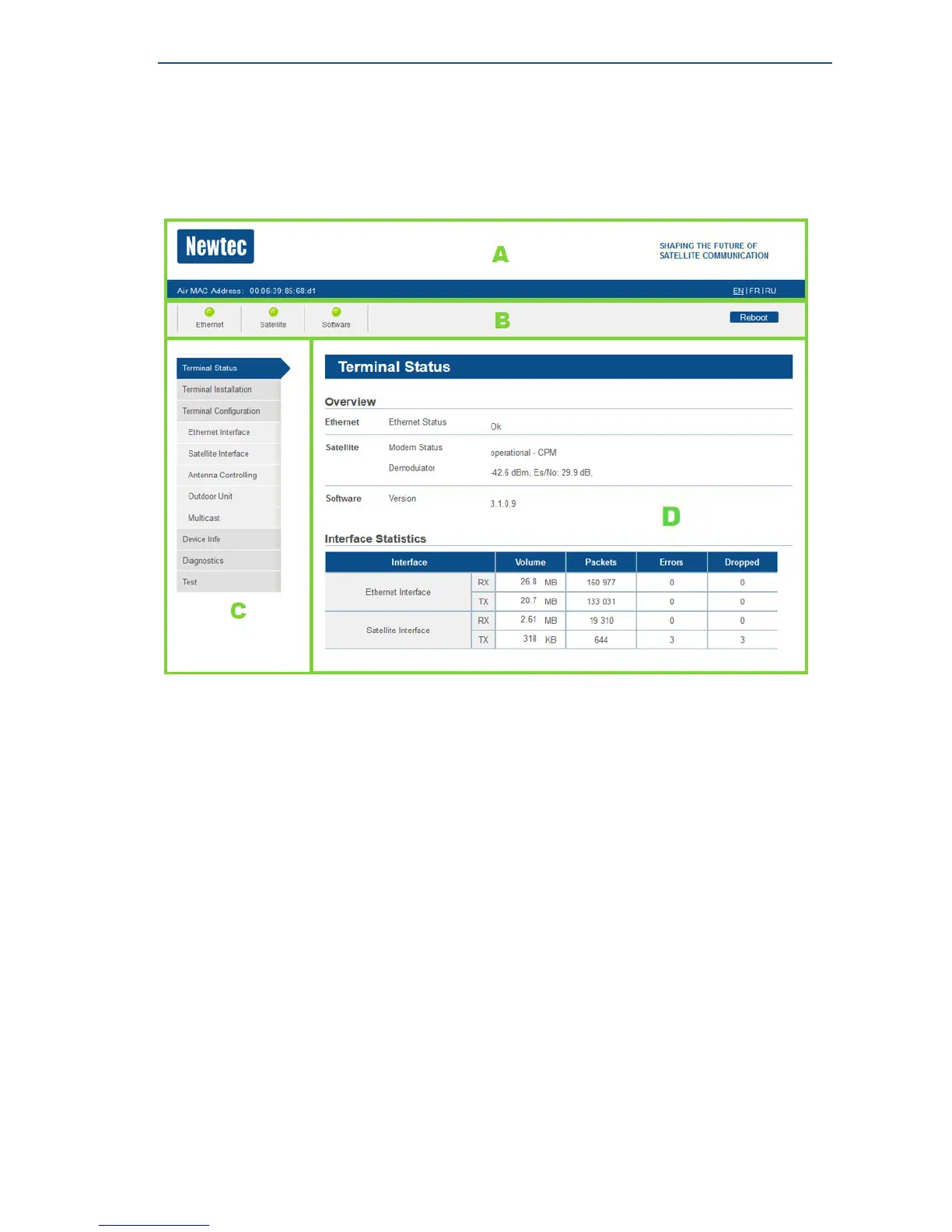 The banner contains the Newtec logo, the Air MAC address and the languages in which the GUI can