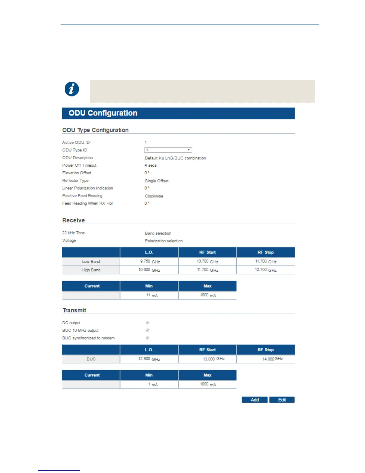 Edit or Add buttons are not present and the ODU configuration settings are read-only.