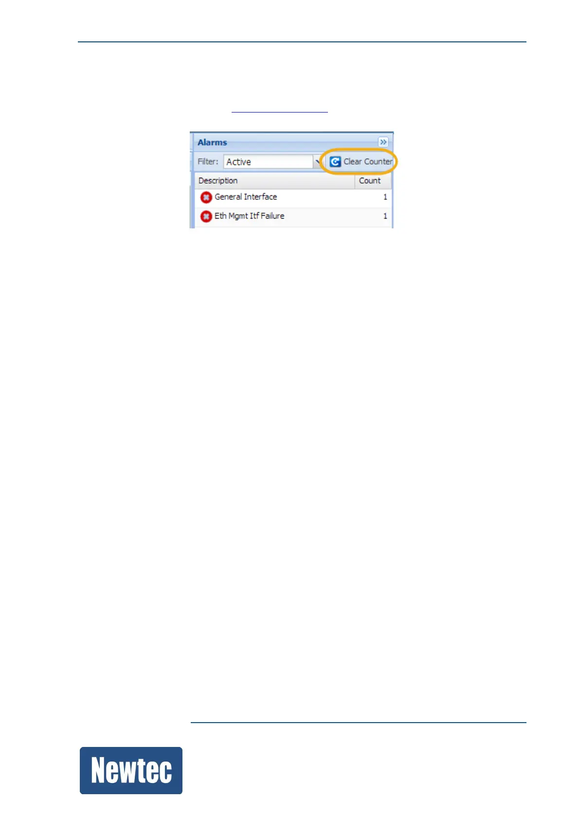 Alarm counters as presented in the AlarmsPaneonpage67 of the GUI and can be cleared all at