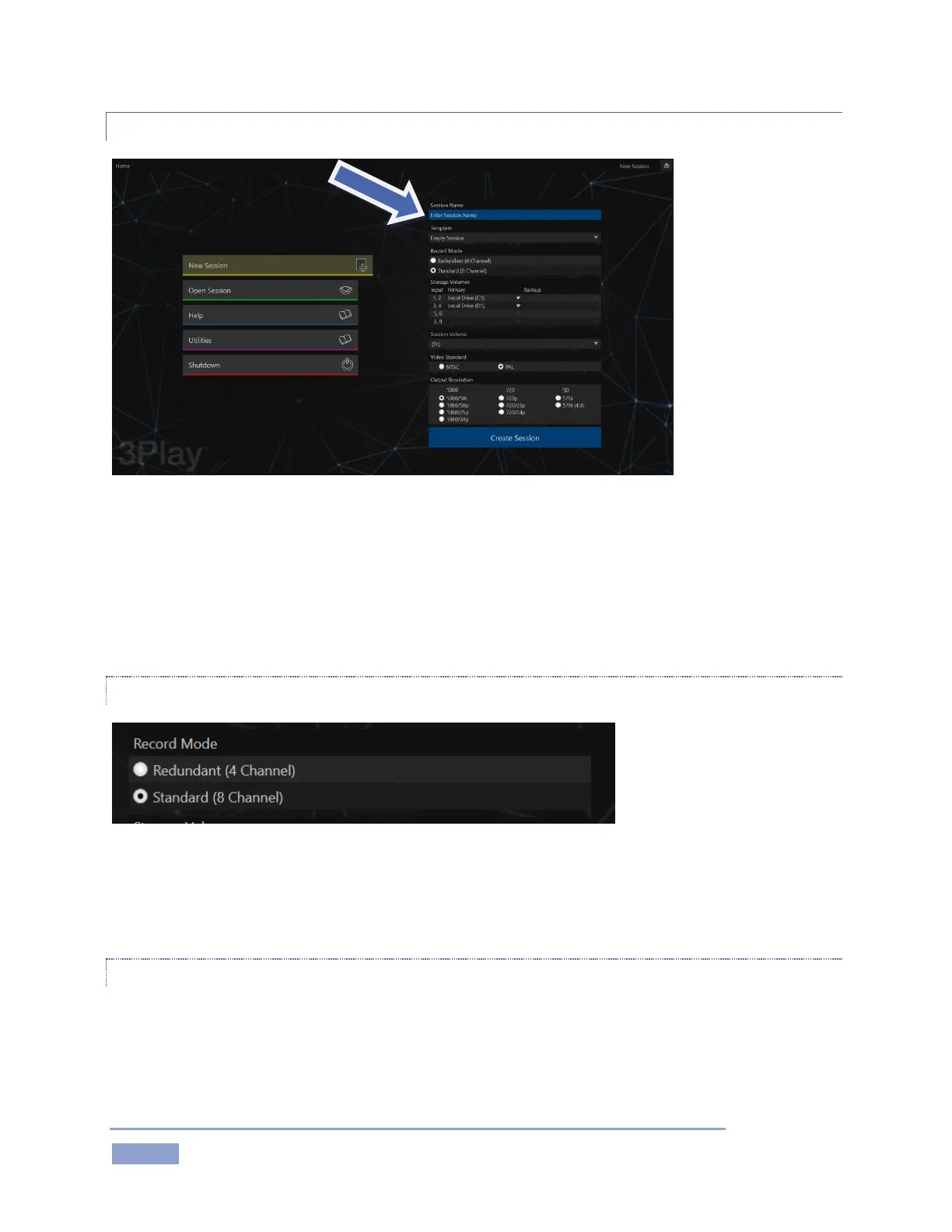 For the 4RU 3Play 3P1 model only, continue with session creation by selecting a Record Mode (see Section