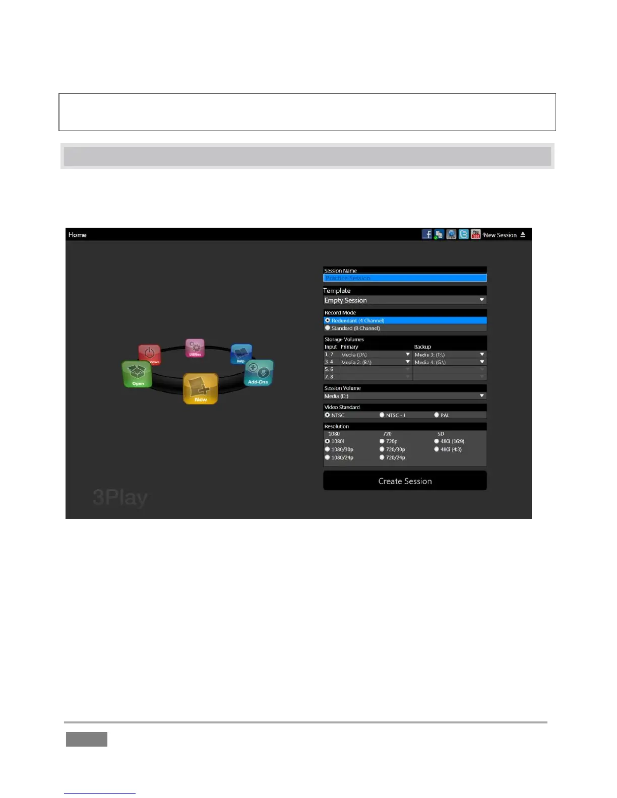 The Startup Screen appears when you power up your NewTek 3Play. This area offers initial