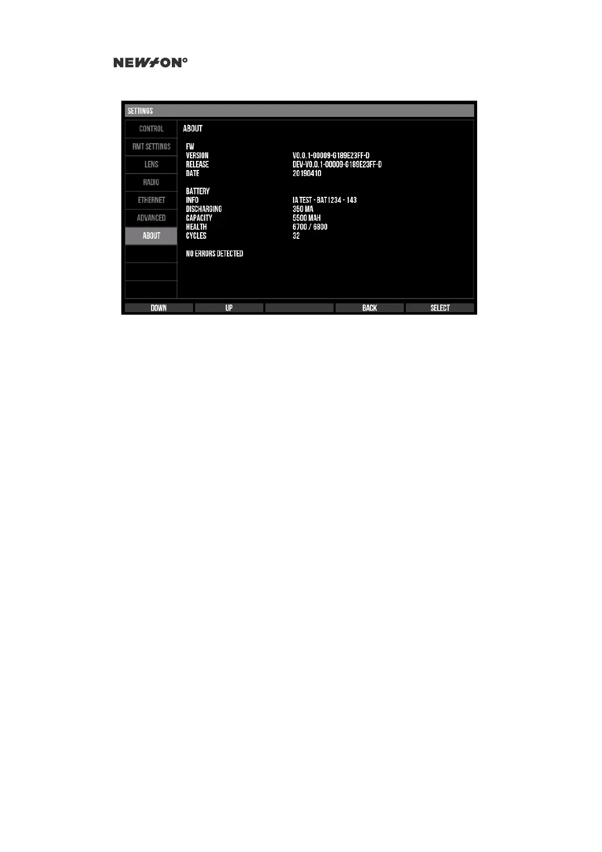 The settings menu contains settings that can be set locally on the Newton head. To access the settings