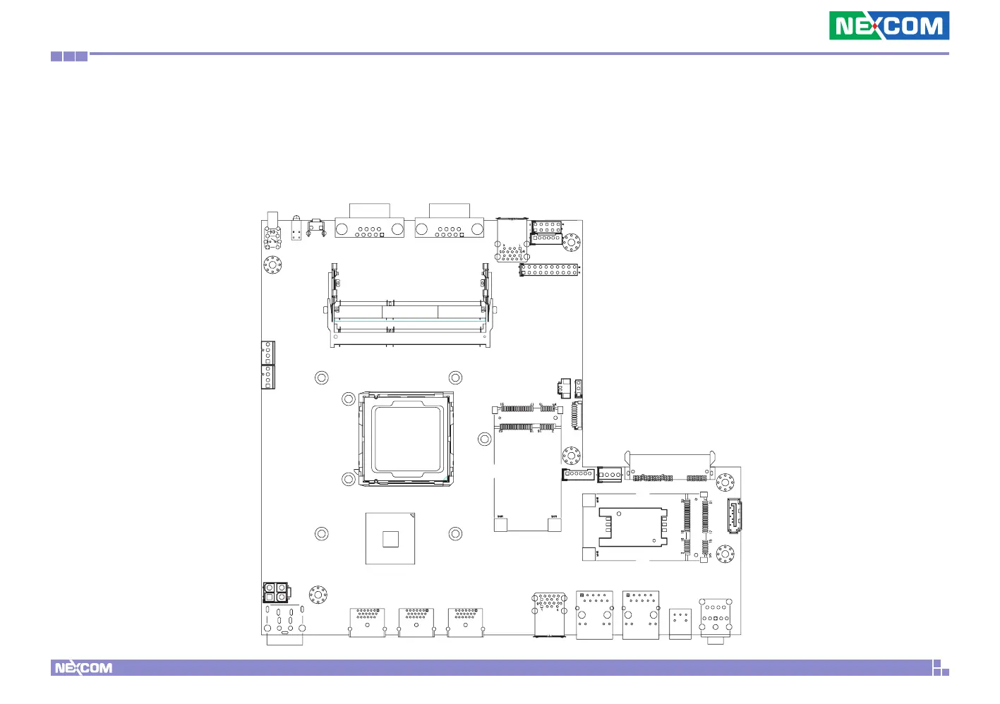 The figure below is the top view of the NDiB B533, which is the mainboard used in the NDiS B533. It shows the locations of the jumpers and connectors.