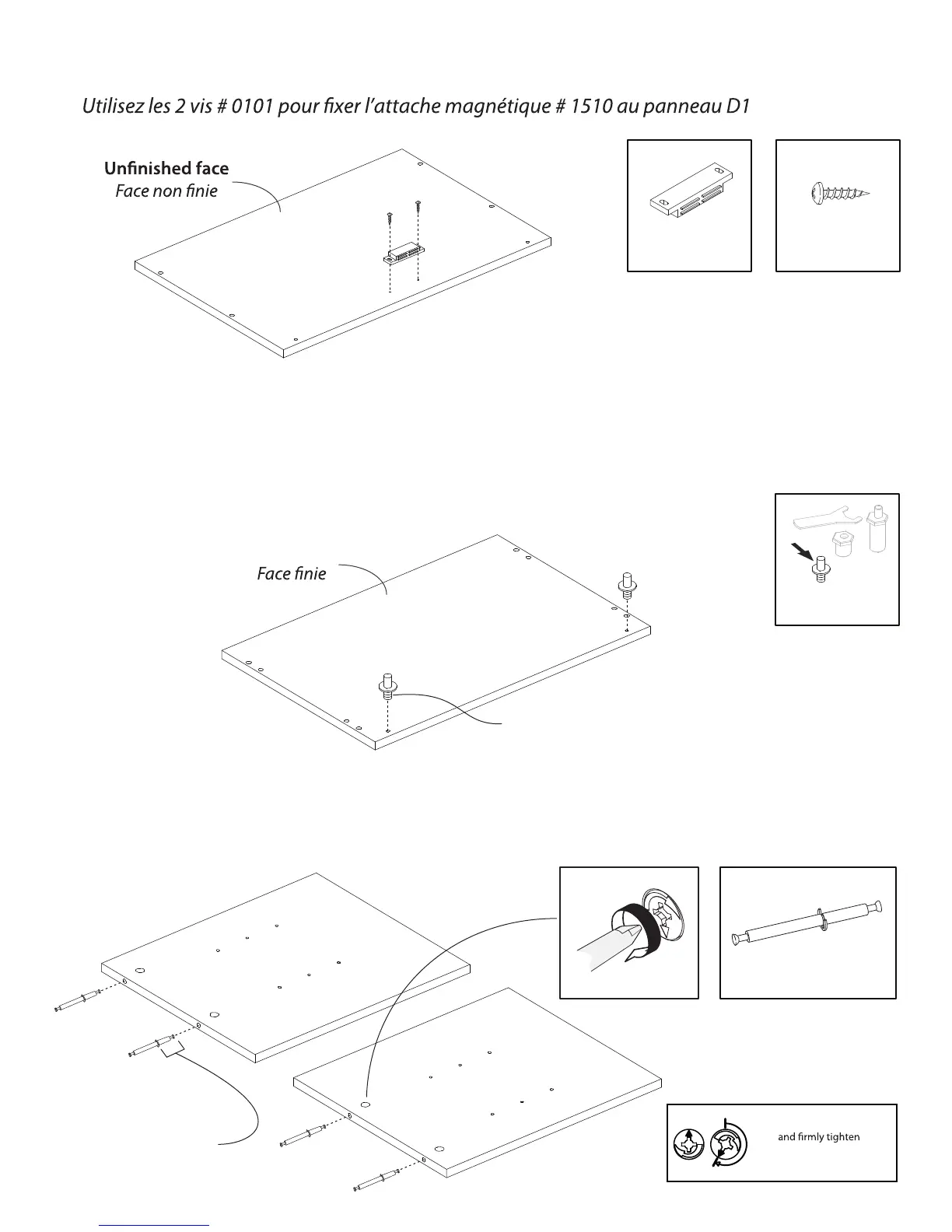 Use the 2 screws # 0101 to fasten the magnetic catch # 1510 to the panel D1